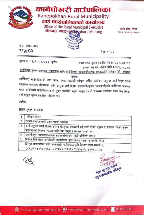 आई.पि.एम कृषक पाठशाला संचालनका लागि आई.पि.एम सहजकर्ता/कृषक सहजकर्ता आवेदन सम्बन्धी सूचना।