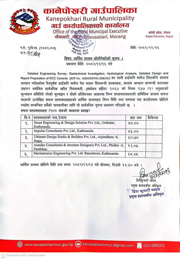 आर्थिक प्रस्ताव खोलिने बारेको सूचना।