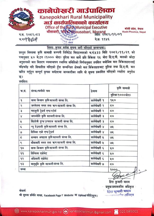 कृषक वर्गमा सूचना जारी गरिएको सम्बन्धी सूचना।