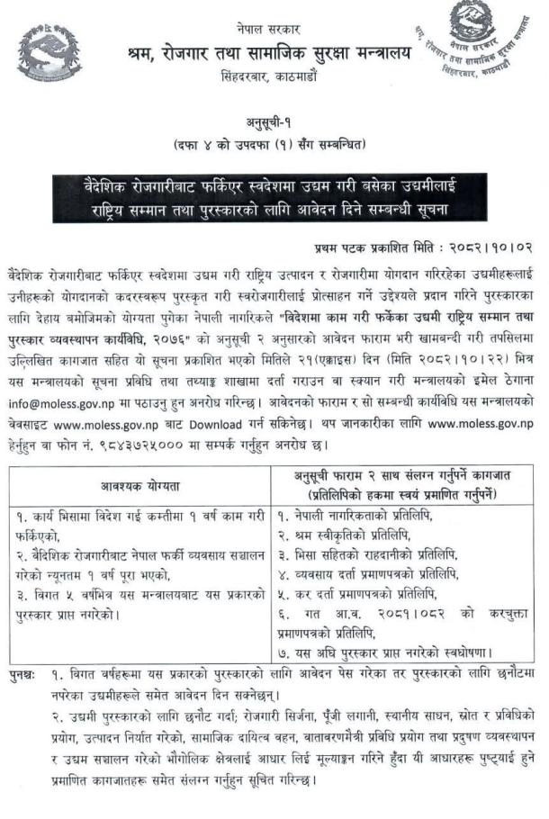 वैदेशिक रोजगारीबाट फर्कीएर स्वदेशमा उद्यम गरी बसेका उद्यमीलाई राष्ट्रिय सम्मान तथा पुरस्कारको लागि आवेदन दिने सम्बन्धी सूचना।