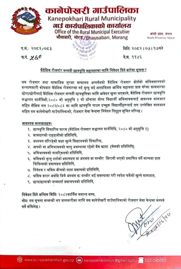 वैदेशिक रोजगार सन्तती छात्रवृत्रि सहायताका लागि निवेदन दिने बारे सूचना।