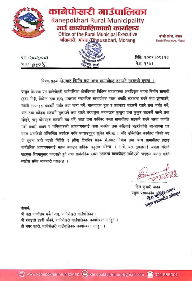 » सडक छेउबाट निर्माण तथा अन्य सामाग्रीहरु हटाउने सम्बन्धी सूचना।