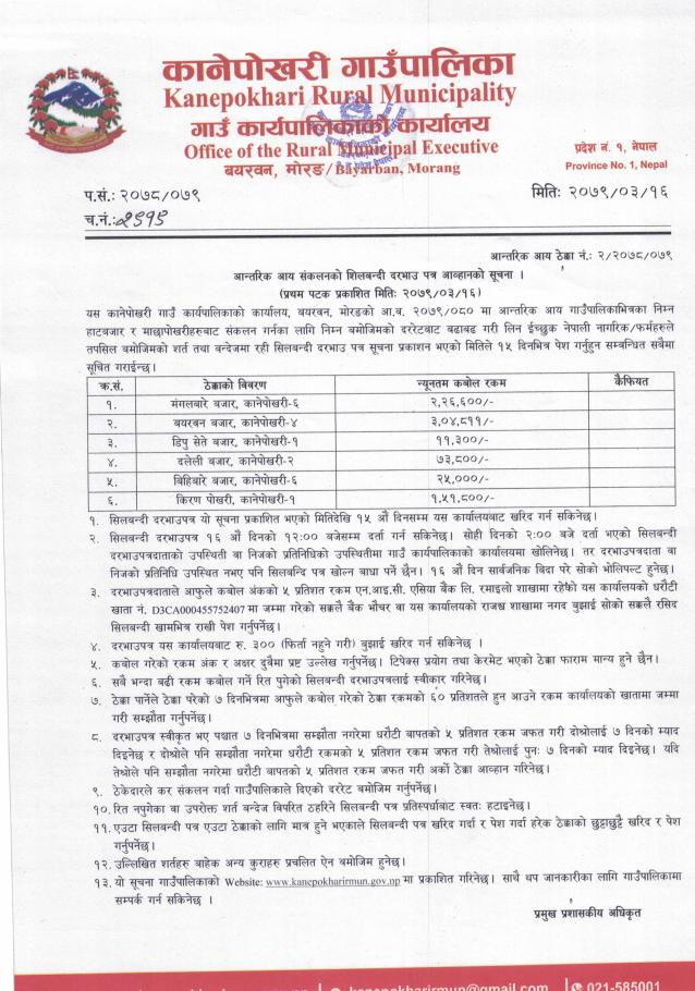 आन्तरिक आय संकलनको शिलबन्दी दरभाउपत्र आव्हानको सूचना ।