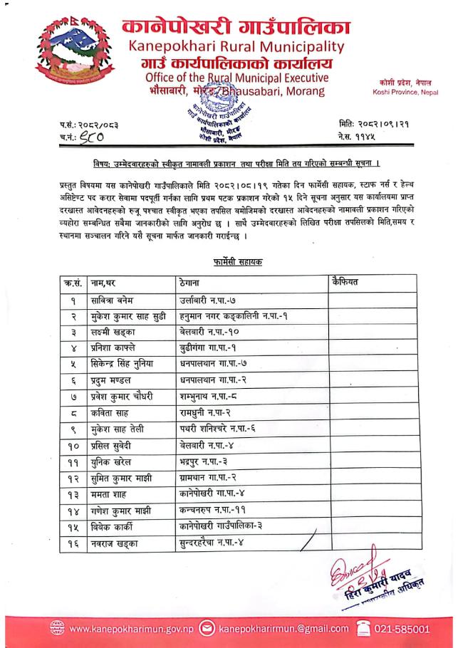 उम्मेदवारहरुको स्वीकृत नामावली प्रकाशन तथा परीक्षा मिति तय गरिएको सम्बन्धी सूचना।