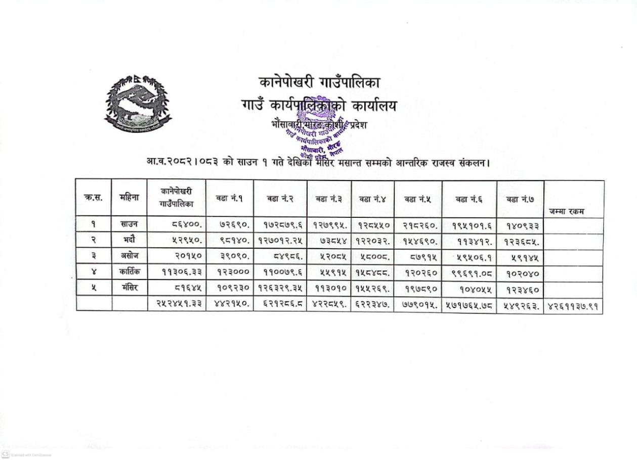 » कानेपोखरी गाउँपालिकाको आ.व.२०८२।०८३ को साउन १ गते मंसिर मसान्त सम्मको राजस्व संकलन विवरण।