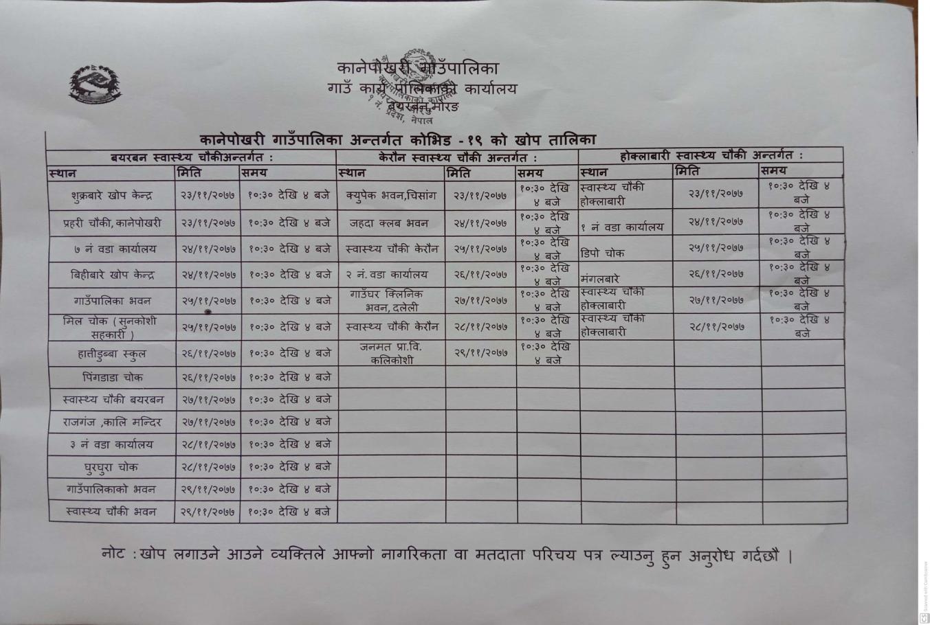 कानेपोखरी गाउँपालिका अन्तरगत कोभिड १९ को खोप तालिका