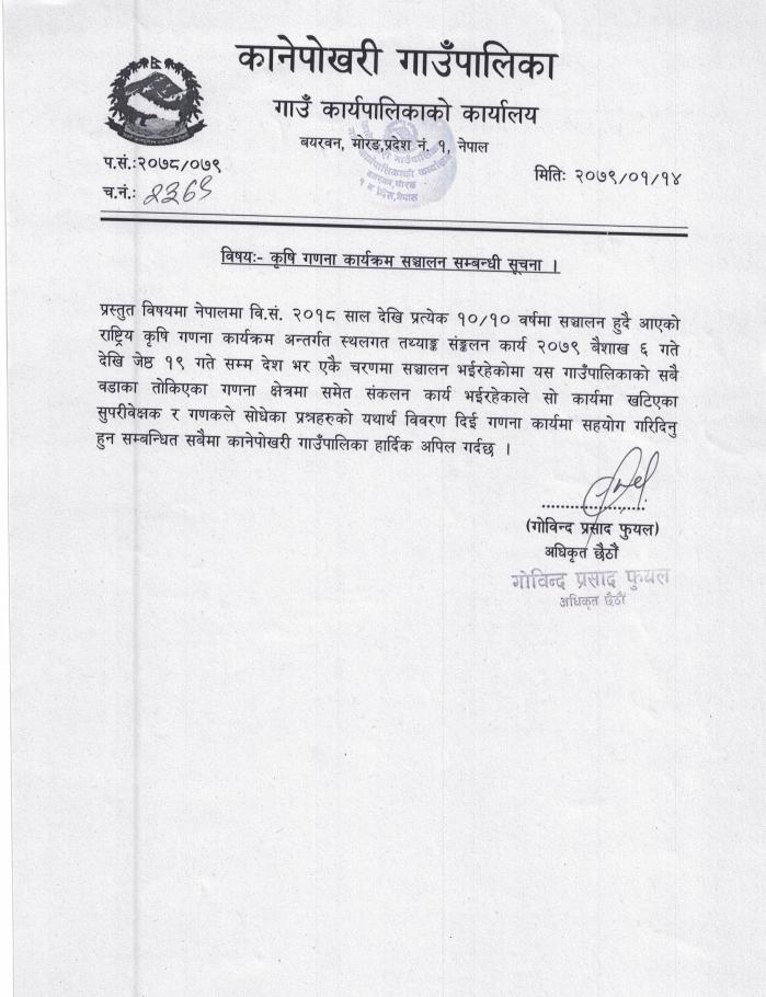 कृषि गणना कार्यक्रम सञ्चालन सम्बन्धी सूचना ।
