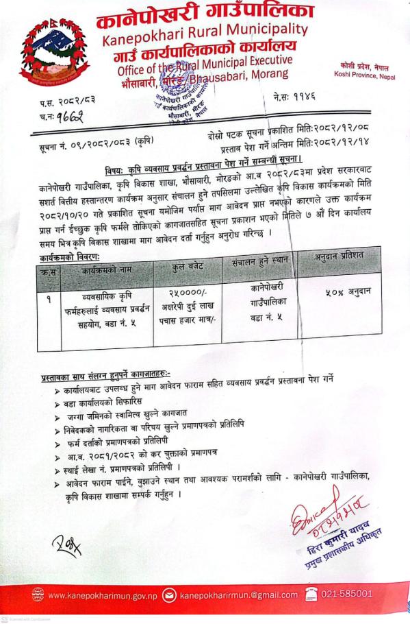 » कृषि व्यवसाय प्रवर्द्धन प्रस्तावना पेश गर्ने सम्बन्धी सूचना।