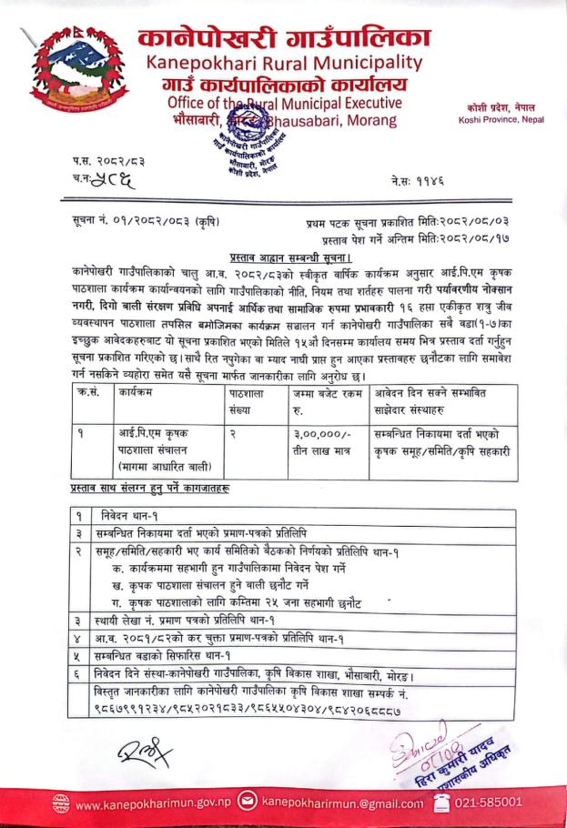 आई.पि.एम कृषक पाठशाला संचालनका लागि आई.पि.एम सहजकर्ता/कृषक सहजकर्ता आवेदन सम्बन्धी सूचना।