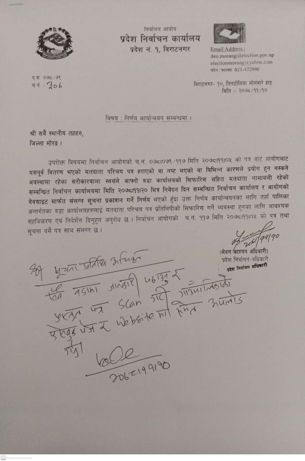 जिल्ला समन्वय समितिको कार्यालय,मोरङबाट जारी मतदाता नामावली दर्ता कार्य सम्बन्धी सूचना।