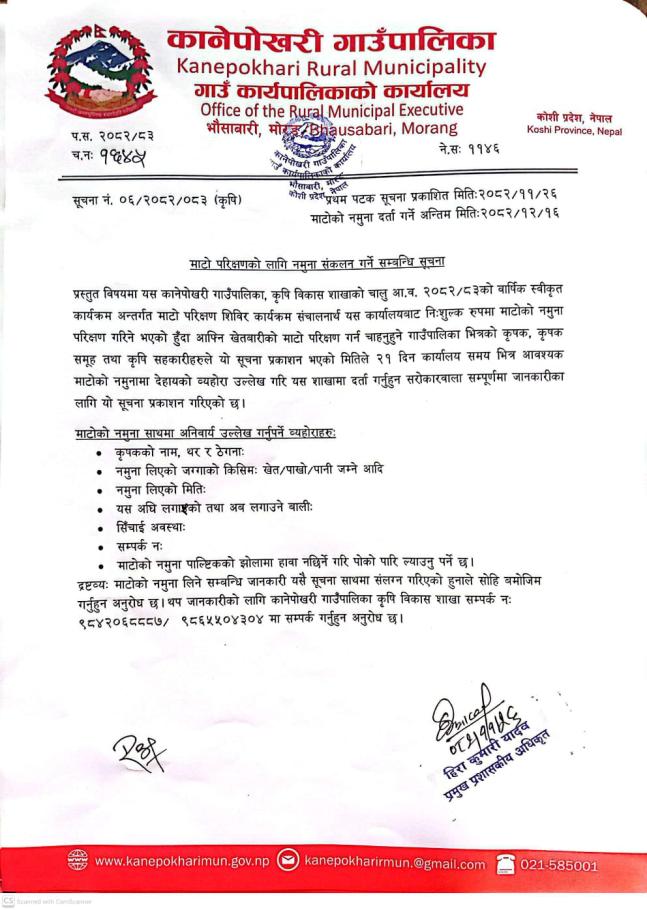 » माटो परिक्षणको लागि नमुना संकलन गर्ने सम्बन्धी सूचना।