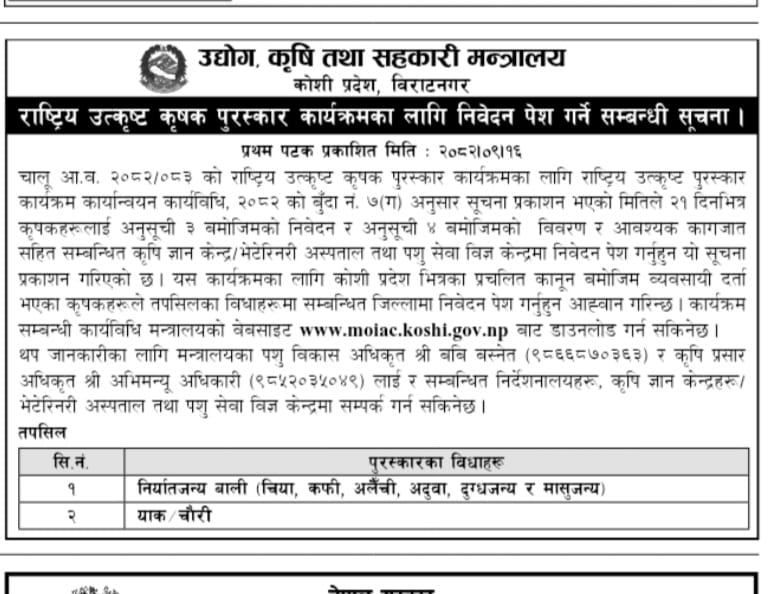 राष्ट्रिय उत्कृष्ट कृषक पुरस्कार कार्यक्रमका लागि निवेदन पेश गर्ने सम्बन्धी सूचना।