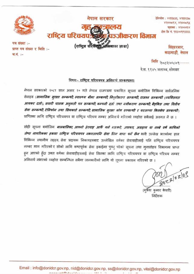 राष्ट्रिय परिचयपत्र अनिवार्य सम्बन्धी सुचना।
