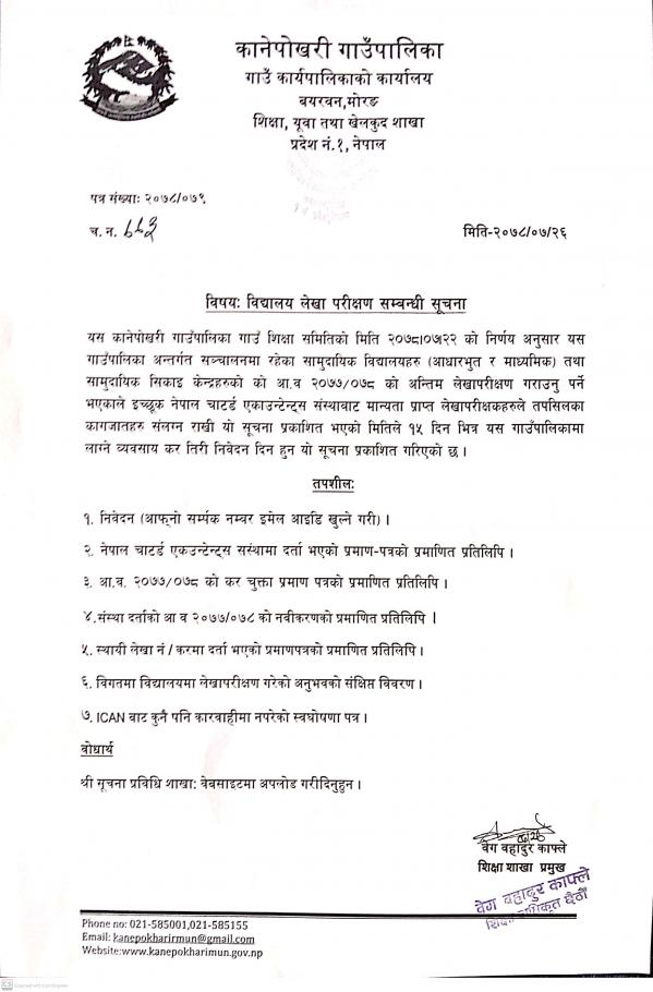 कानेपोखरी गाउँपालिकाको सामुदायिक विद्यालयहरुको लेखा परिक्षण सम्बन्धी सूचना ।।