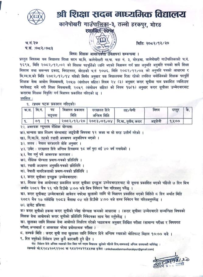 शिक्षक आवश्यकता (विज्ञापन) सम्बन्धी सूचना।