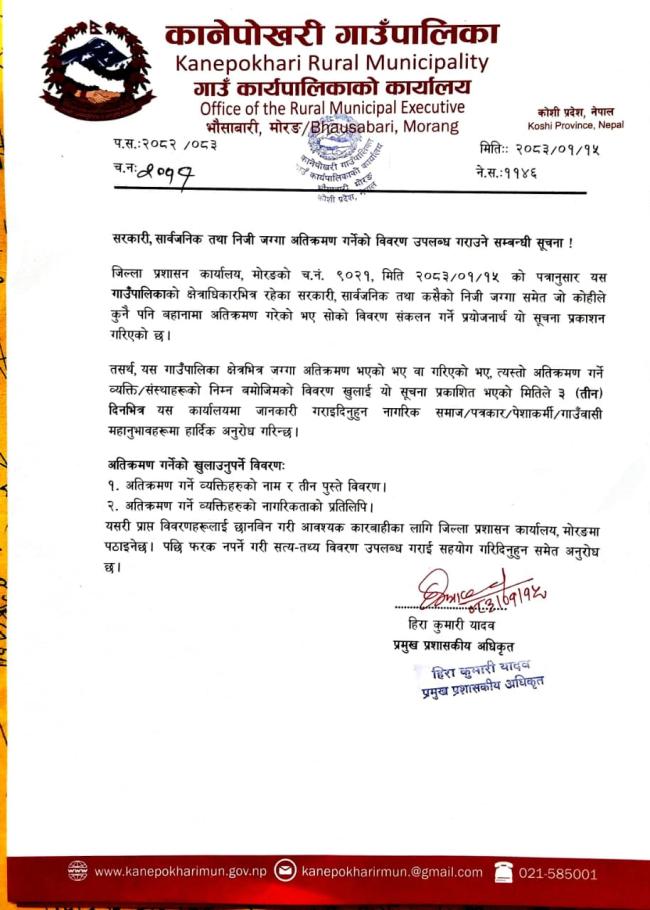 » सरकारी,सार्वजनिक तथा निजि जग्गा अतिक्रमण गर्नेको विवरण उपलब्ध गराउने सम्बन्धी सूचना।